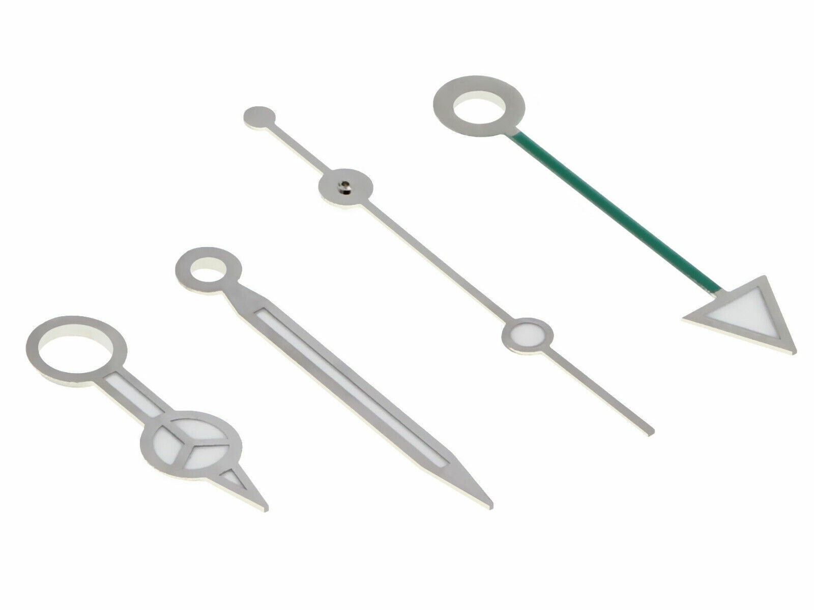 The item for sale are brand new aftermarket luminous watch hands in silver color and it lume green in dark with green gmt hand.